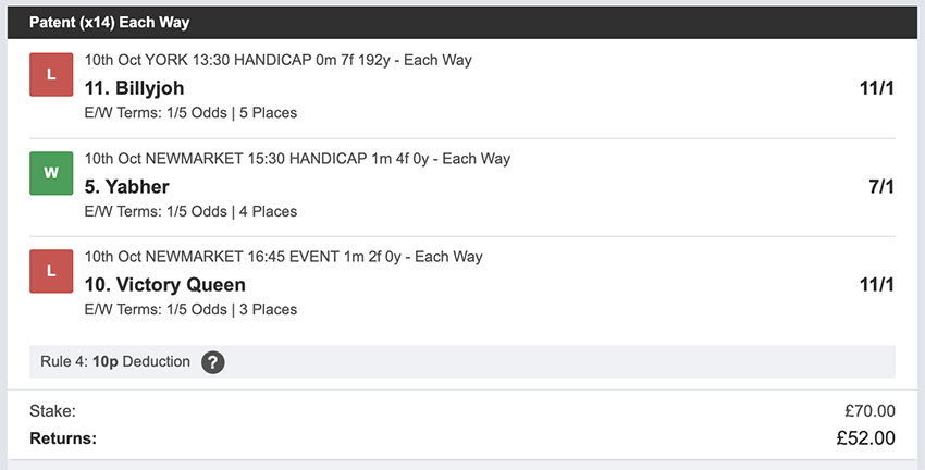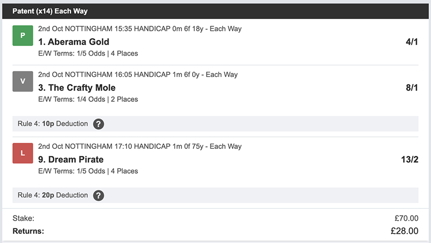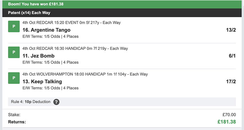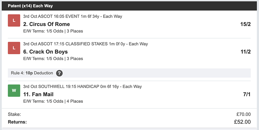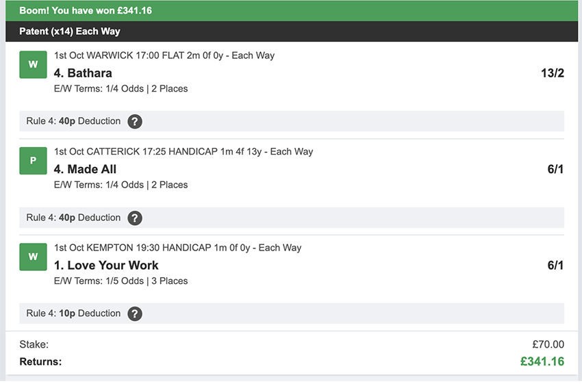 There were 25 betting days in September, taking out Sunday's and the strike day. We made a profit on 10 of these, so more days ended in a loss than a profit, but only 2 of these days saw the full stake lost, every other day saw at least a partial return. Taking out non-runners there were 73 selections: 16 winners (21.9% strike rate) 58.9% of selections saw a win or place. Here's how October's going... 1st October