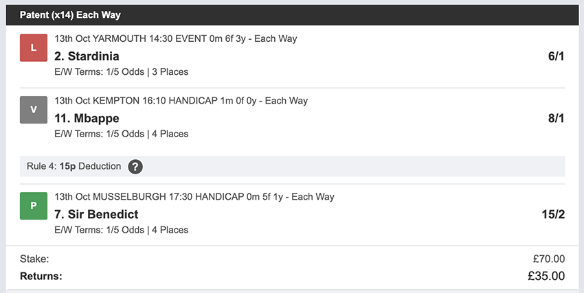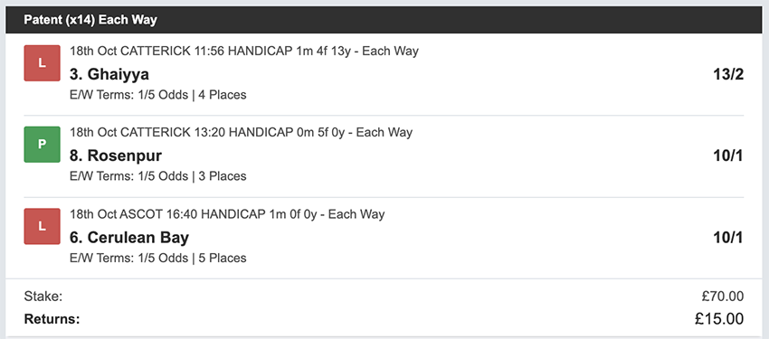 Profit/Loss +£806.40 12th October No Bets on Sundays 13th October