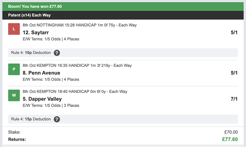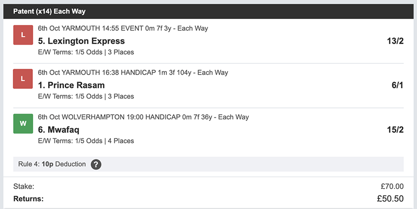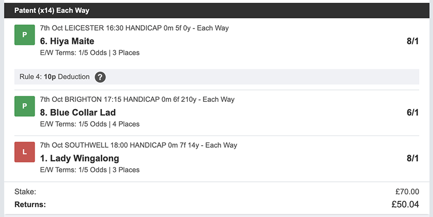 Profit/Loss +£111.38 5th October No Bets on Sundays 6th October
